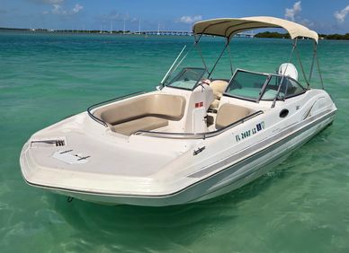 If you have a large party or just want the most comfortable ride possible, rent the mac daddy of all deck boats! Our 24' sled can accommodate parties up to 8 and has a large bimini to keep you in the shade! This one goes fast so call now to reserve! Pet friendly and cooler included.